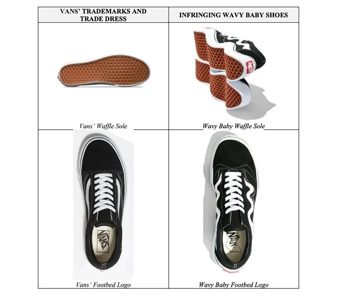 近日,Vans将MSCHF给起诉了。并列出了一系列Wavy Baby和Vans Old Skool相似的对比图,任谁看,这都是“变形”的了Vans鞋子。