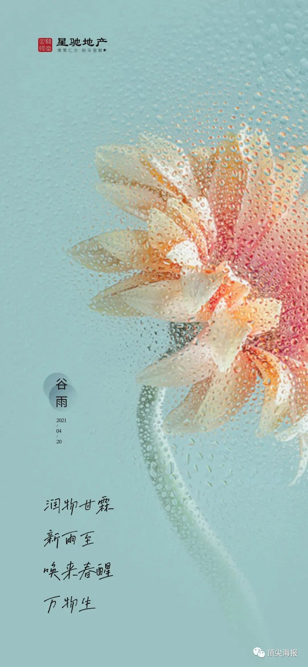#泸州老窖用二十四节气陪你喝酒# 谷雨,雨生百谷,水润万物。落入泥土万物生长,嵌入美酒酒香缕缕,汇入文字诗意浓香。今天是#联合国中文日#来说说关于水有哪些优美的中文?一同沉醉在中文里。春季的最后一个节气悄然来临,谷雨前后雨水充沛。雨滴宛如大珠小珠,落入草间,落于花瓣之上。而谷雨的到来也意味着寒潮天气基本要结束啦,气温加快步伐回升。鲜花吐蕊,大树生枝。一切都在焕发着勃勃生机,在温暖中感受万物皆美好吧!