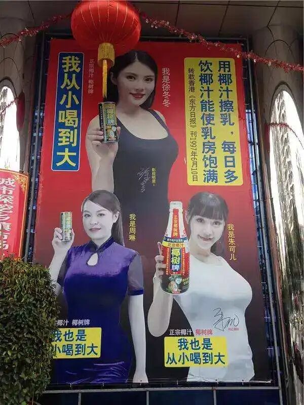 让人惊呆的是,这和去年发布的广告,不能说一模一样,只能说完全一致。不过大梨子还是发现了其中隐藏的端倪:“肯定有美女帅哥追”换成了“有前途,能致富”,这年头,像大梨子一样细心的人不多了呀...那么问题来了,去年在互联网掀起“龙卷风” 争议的广告,怎么今年又如法炮制了?这个广告可是被监管部门罚了40万!为何罚款?具体原因是“妨碍社会公共秩序或者违背社会良好风尚”。2009年,椰树集团因在广告中采用“木瓜饱满我丰满”等广告字眼,被处以1000元的罚款。2016年,椰树集团还曾因推出过一款“胸模瓶”矿泉水陷入争议。该“胸模瓶”瓶身中上部为女性形体状。椰树集团当时回应称,是为展示女性美。2019年椰树又因为产品与“丰胸”产生关联,被国家广播电视总局指出,部分版本广告,宣扬低俗内容,价值导向存在偏差,做出停播处理。工商局也作出罚款20万元处罚。不得不感叹,椰树集团这岁岁年年相似的设计风格,怎么就如同岩石一般顽固。网友们也对此有着“万花齐放”的争议,大致分为几大流派...