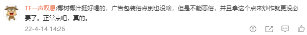 关于椰树包装上印的电话号码,只要熬过了土味铃声的刺激后,就能跟一个南方口音的神秘大叔,关于产品的“天南海北”,无所不聊,如此用心与用户真诚交流。也正如网友所说:“因为椰树靠的是好喝啊,现在出了那么多牌子的椰汁,没一个超越椰树”、“丑归丑,好喝才是它风靡的真正原因”、“好喝到让人不得不接受它的难看…”,能在恶俗营销中还收获忠实粉丝,好喝才是硬道理这话没毛病。包装上直观传递品牌信息:“海南岛新鲜椰肉鲜榨”、“不加香精”……把自己的优势摊开说明白,让消费者轻松理解,深化认知。营销纵然是剂猛药,但如果只想依赖于恶俗营销来赚取流量,对于品牌形象无疑是弊大于利的。