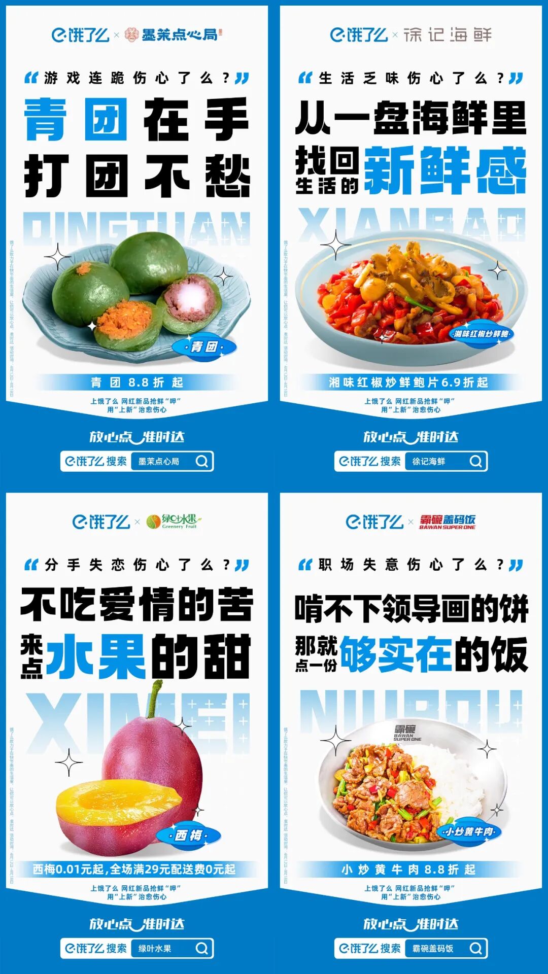 在饿了么的每一张海报中,我们都能看到品牌利用了很日常对话的方式来安慰各种场景下伤心的“你”,同时还不忘把美食的信息融入其中,传递出一种生活尽管不开心,但是干饭还是很欢乐的干饭人心声。