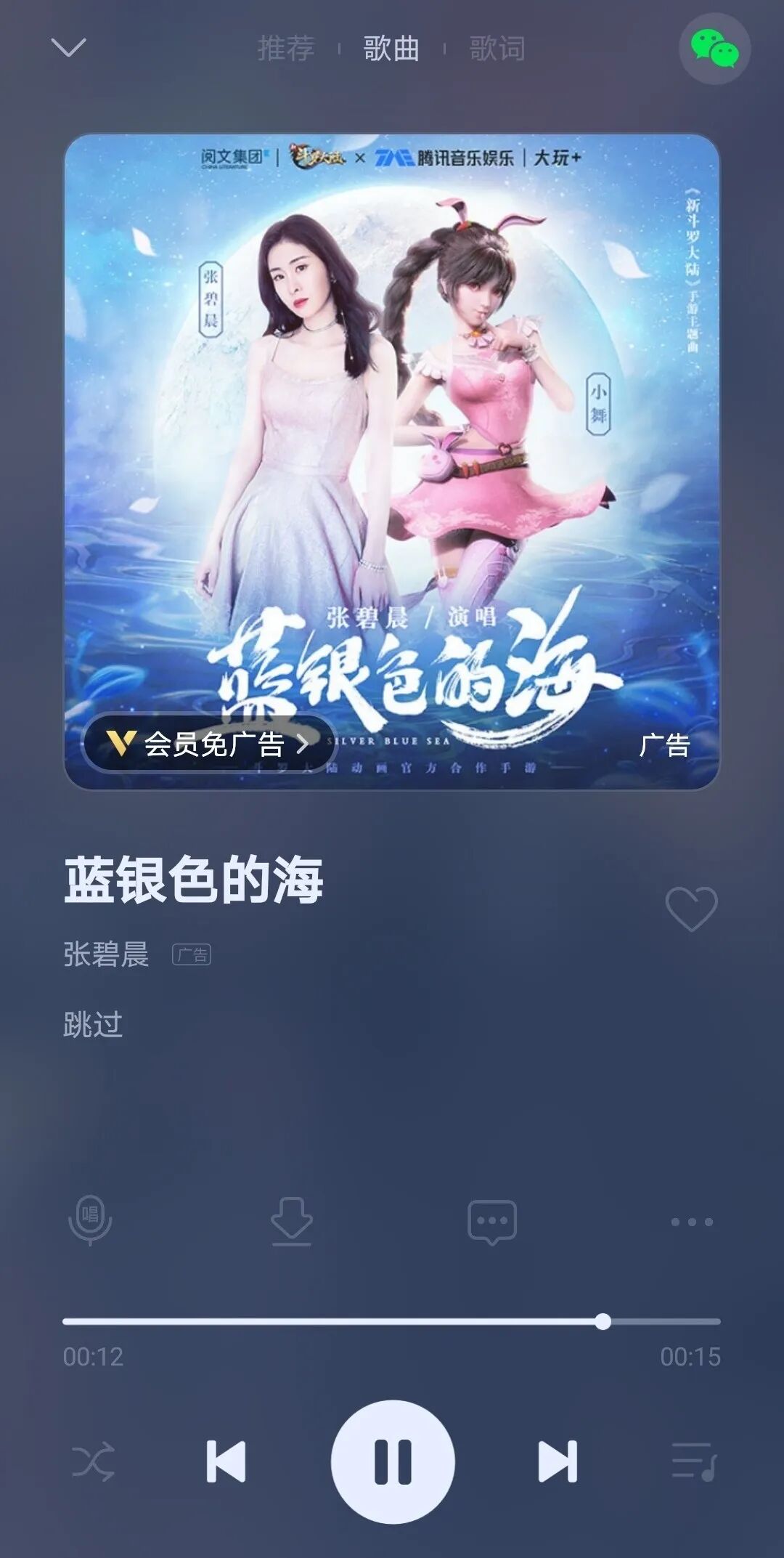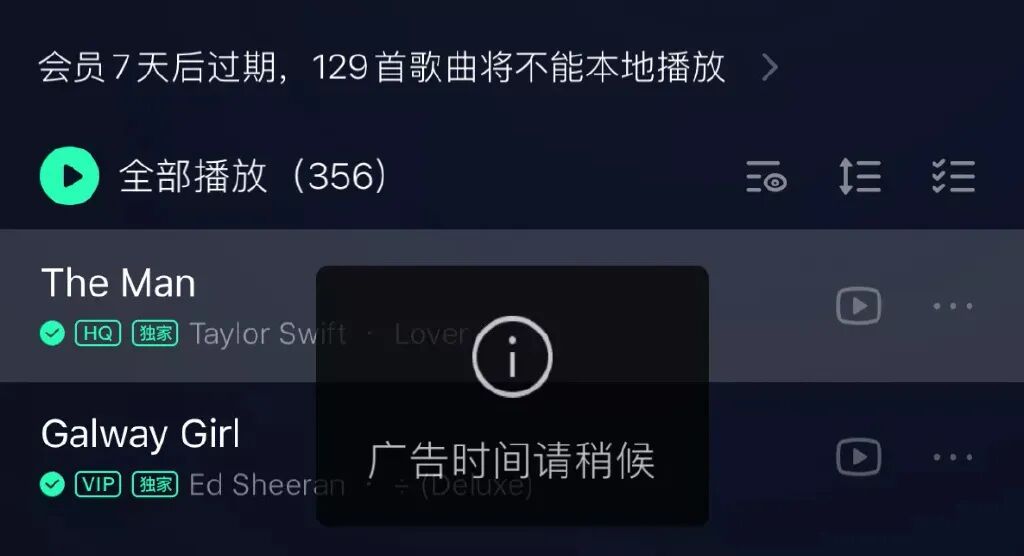 2. 歌曲切换中会插入约15秒广告,