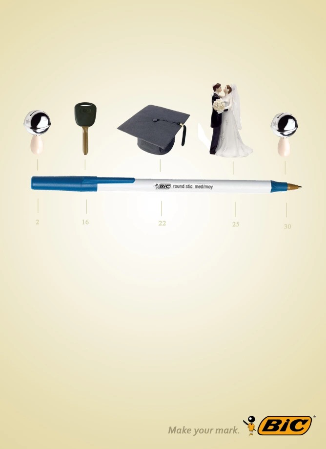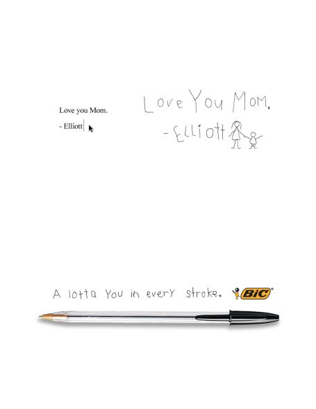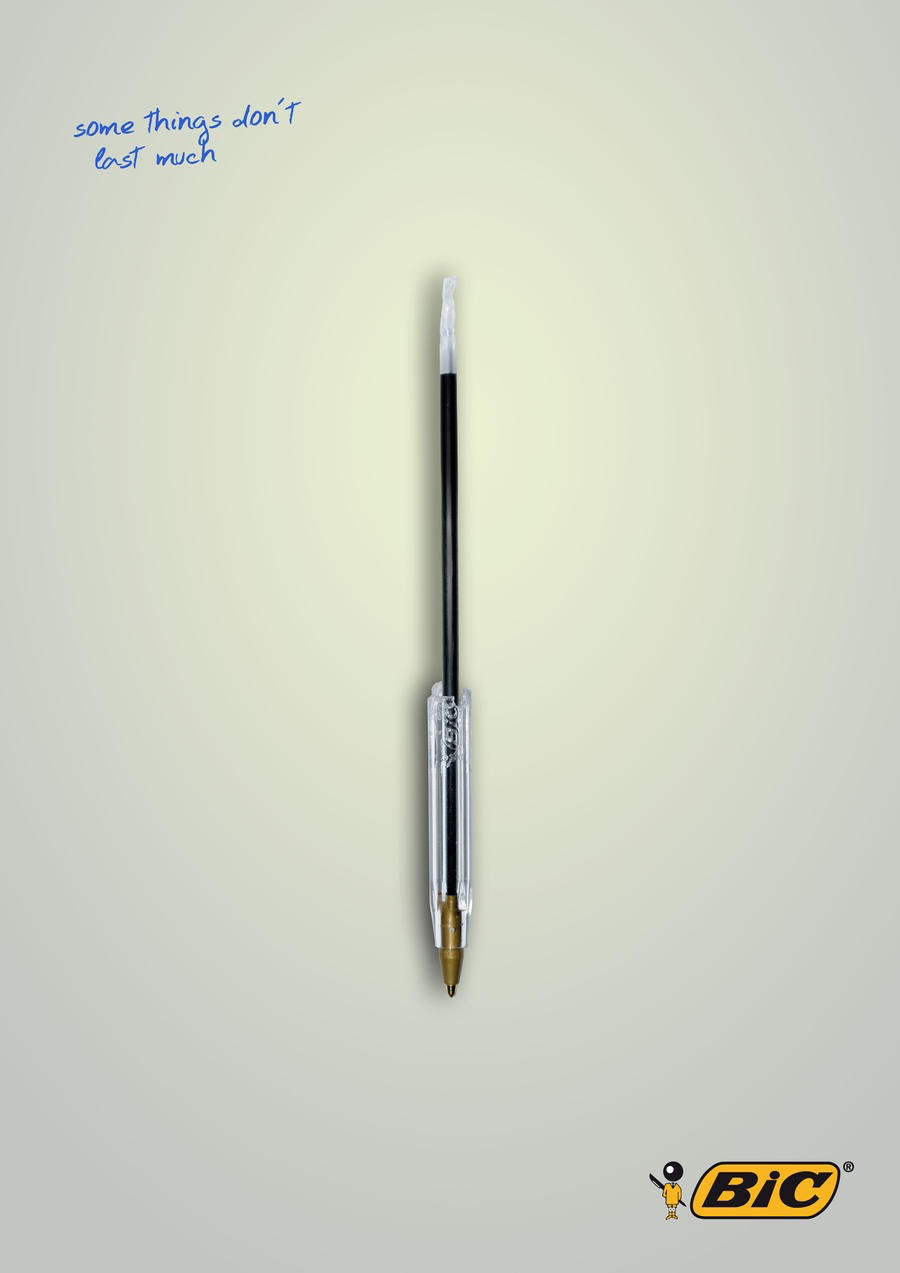 some things don't last much.因为“创意概念”超级稳定且单纯,BiC是非常好的广告训练素材,经常被作为广告学院的比赛课题。这是来自阿根廷布宜诺斯艾利斯的广告学院比赛作品,意为当你不得不持续画下去的时候,你需要一支BiC。来自美国视觉概念学院为BIC做的平面广告,左边是用短信写下的“Love you Mom”,而右边是用BiC写的、带有更多情感的“Love you Mom”。意为如今人们之间的沟通多是通过手机和网络,相对于从前用一支笔亲手写下的文字,少了很你的情感表达。早已习惯了打字的我们,是否开始怀念书写的感觉,不如像这个海报说的——Start something 开始写点什么吧。