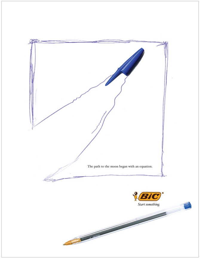 The path to the moon began with an equation.看完之后,不知道你是否和我一样,特别想去买一支BiC来用?其实好用的圆珠笔岂止一个BiC?但这些广告通过围绕单一创意概念的持续输出,在不断强化价值认知的同时,也靠着有趣的创意赢得了受众好感,最终带动BiC畅销半个多世纪。好的创意,不仅可以让你消费产品,更重要的是可以让你爱上这个品牌,或许,这就是创意的力量吧。本文系作者授权首席营销官发表,转载请联系该作者