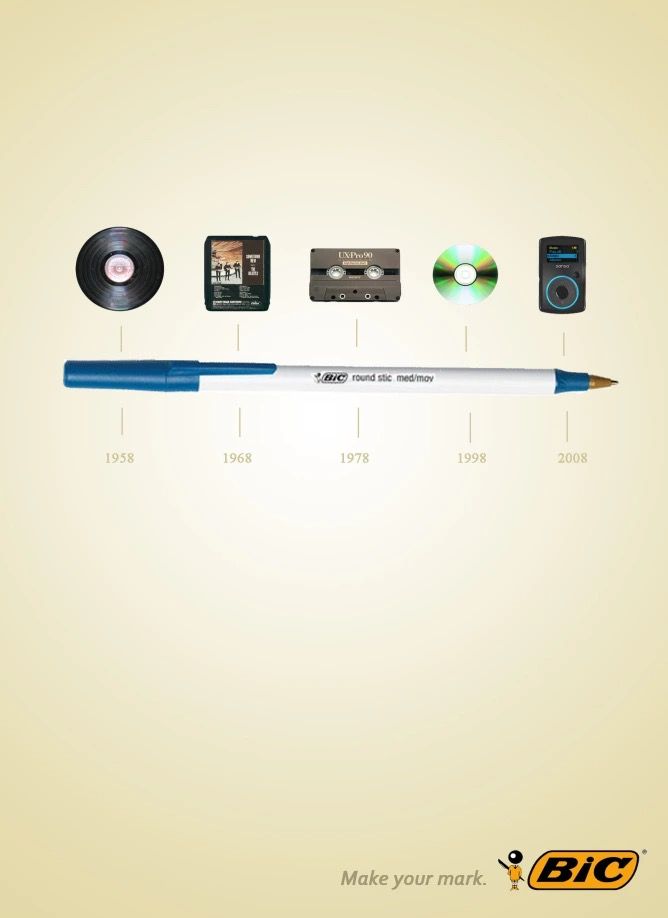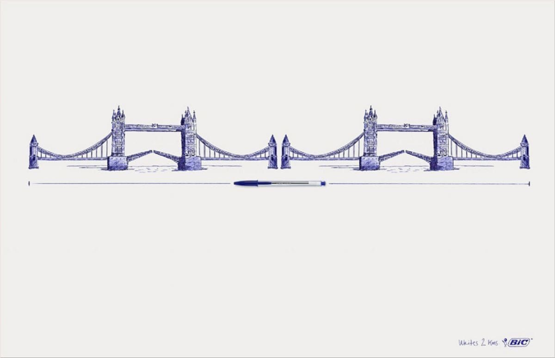 前面用书的厚度、信息的广度来体现BiC的持久,下面则用穿越时代的长度来体现BiC的稳定。不仅能够穿越时间的长度,当然也可以穿越物理的长度,用一支笔,可以写够两公里。
