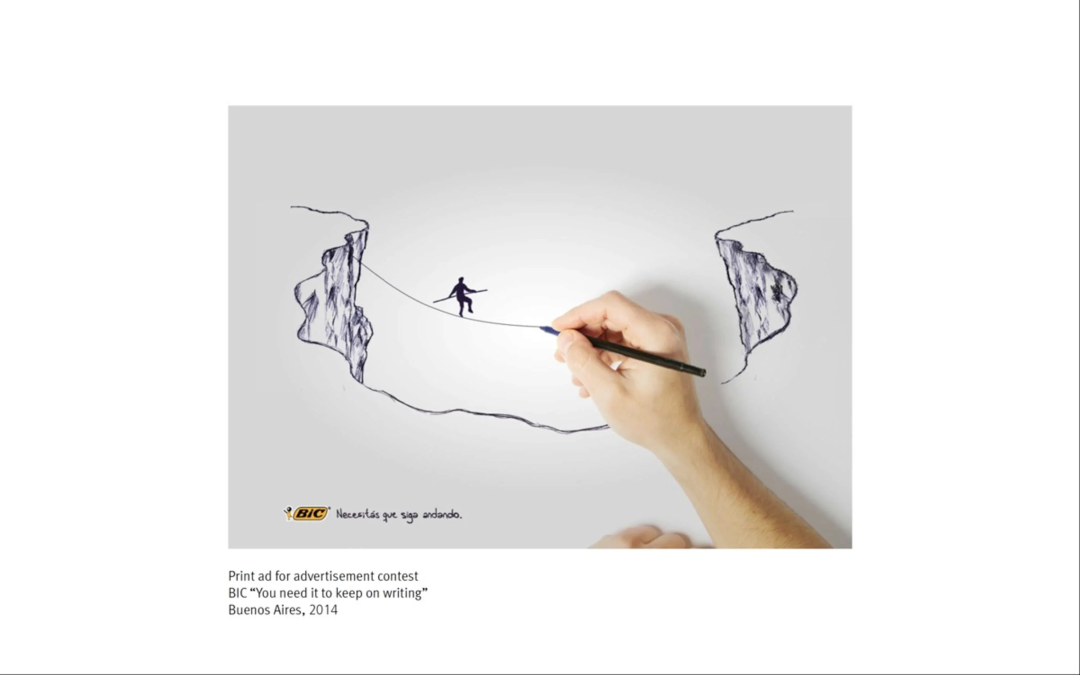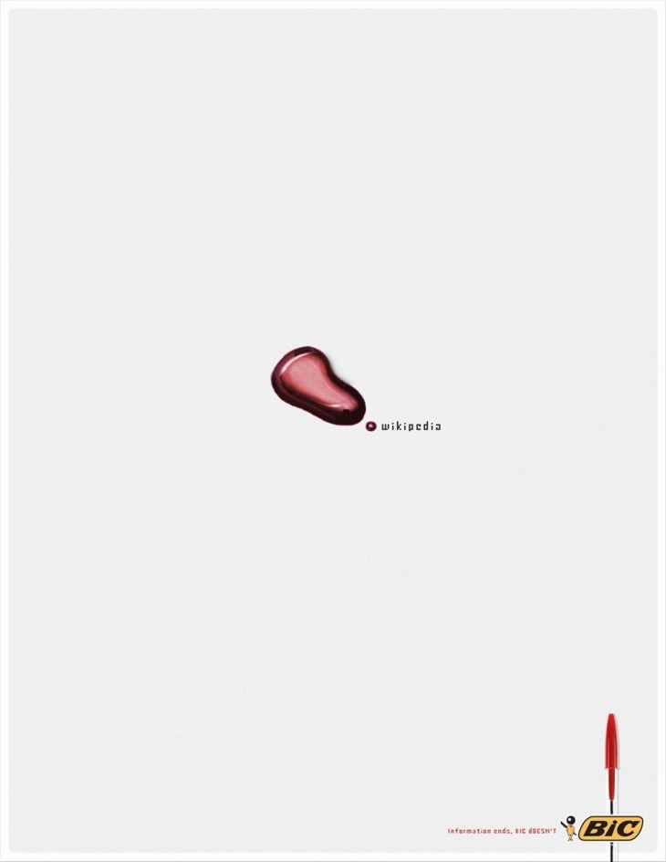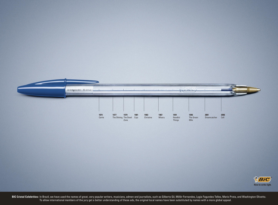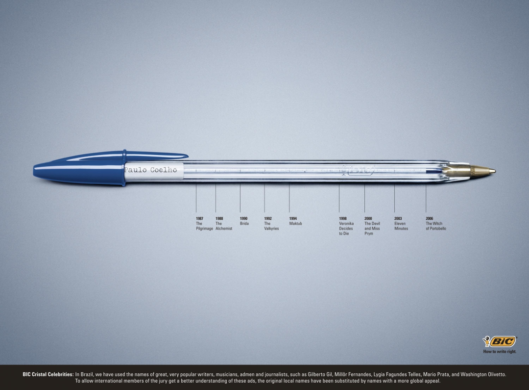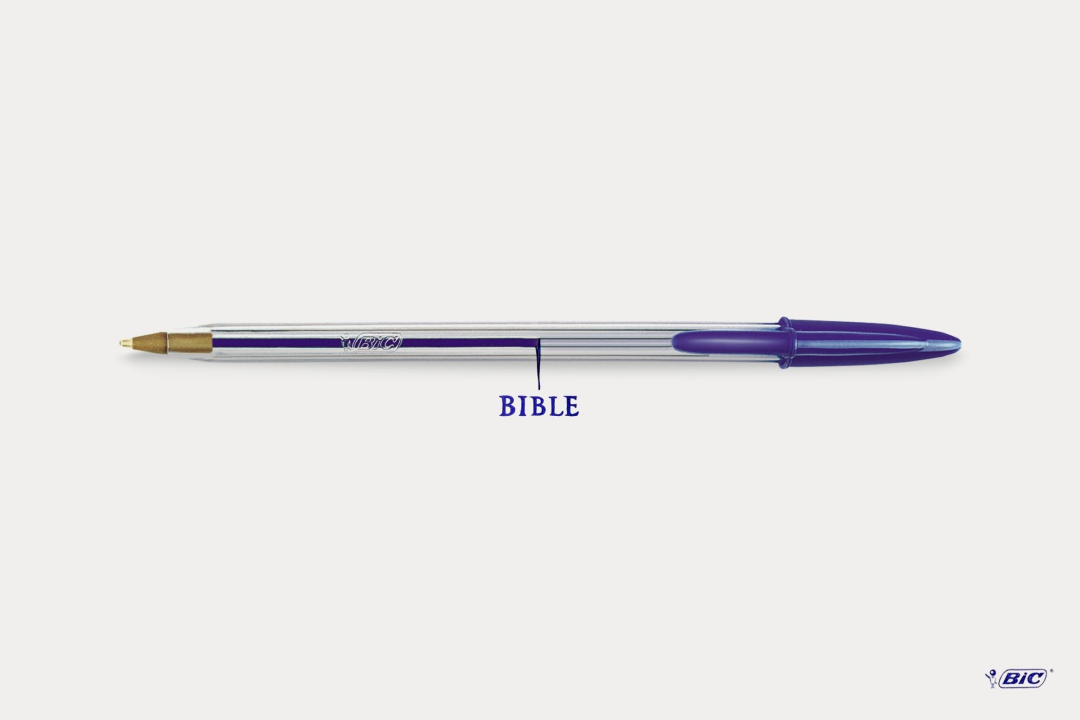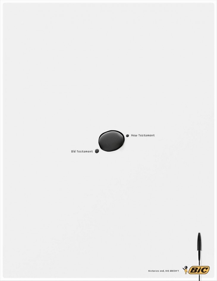 很多人喜欢用笔写文案,假如让你为一支笔写一则文案,你会怎么写呢?表面上看这个文案很懒,但究其深层原因,是这个文案很懒的同时,这个品牌的创意概念也非常稳定。我们说一个好句式可以写出一句好文案,一个好的创意概念,则可以写出100句好文案。BiC圆珠笔是公认的全球品质最好的圆珠笔之一,它的广告创意概念就和他的产品一样,非常稳定。这个品牌从诞生开始,所有的广告表现基本都是基于同一个创意概念:Get a pen you can rely on.下面就一起来看看,BiC圆珠笔的文案是如何变着花样来诠释这个概念的。史上最畅销的葡语作家保罗·柯艾略写完9部著作的用水量然后还有更更夸张的,《圣经》的新约和旧约,三部《矩阵》的文字量,整个维基百科的信息量,对于BiC的水量来说,只占那么一丢丢。New Testament,Old TestamentHistoroes end,BiC doesn't