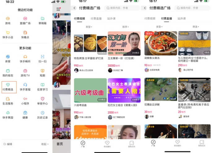 快手在2020年之前就开辟了“付费精选”,包括付费直播、付费短视频,以及付费录播课程,价格从几元到几千元不等,与知识付费玩法相仿。