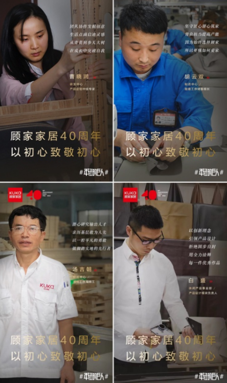 此外,顾家家居还以海报形式刻画出不同岗位的员工群像,通过普通工作者严谨踏实,创新钻研的工作态度彰显品牌 40 年来致力于「为每一个奔赴向往生活的人创造幸福依靠」的初心与信念。每一位顾家人,都当得上是当代“年轻的巨人”——员工杜雪每次为了订单,可以连续打几十个电话,每次都打半个小时以上,她的坚韧与执着是劈开前路荆棘的最好武器;被同事称为“死心眼”的杜伟从不放过任何一个产品质量和制作工艺,直到推敲出最优的方案才能投入生产,不愧为顾家家居的基层匠人;52岁的康师傅15年来一直担任上门沙发清洗保养的监督岗,连续4年蝉联五星服务者的光荣称号,用户的满意是他不断完善服务品质的最大动力。正因为顾家背后一个个对工艺、品质、服务精益求精的“巨人”,才支撑着顾家走到今天,凝聚出常葆初心坚定向上的“巨人”精神。