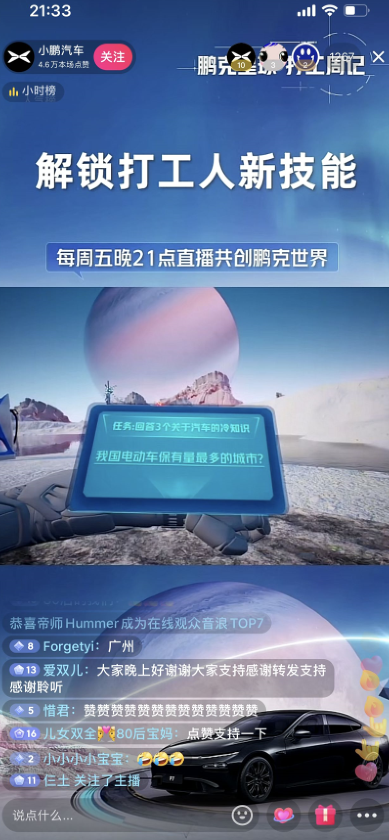 前段时间,小鹏汽车在抖音平台开创了一个名为鹏克星球的元宇宙世界。据了解,鹏克星球在小鹏汽车官方账号每周五9点准时开播,自4月1日首播以来,吸引了超两千万网友观看,后台点赞量、热度火爆异常。令人眼前一亮直播玩法,让不少习惯了叫卖式广告的网友感受到了前所未有的新奇互动体验。