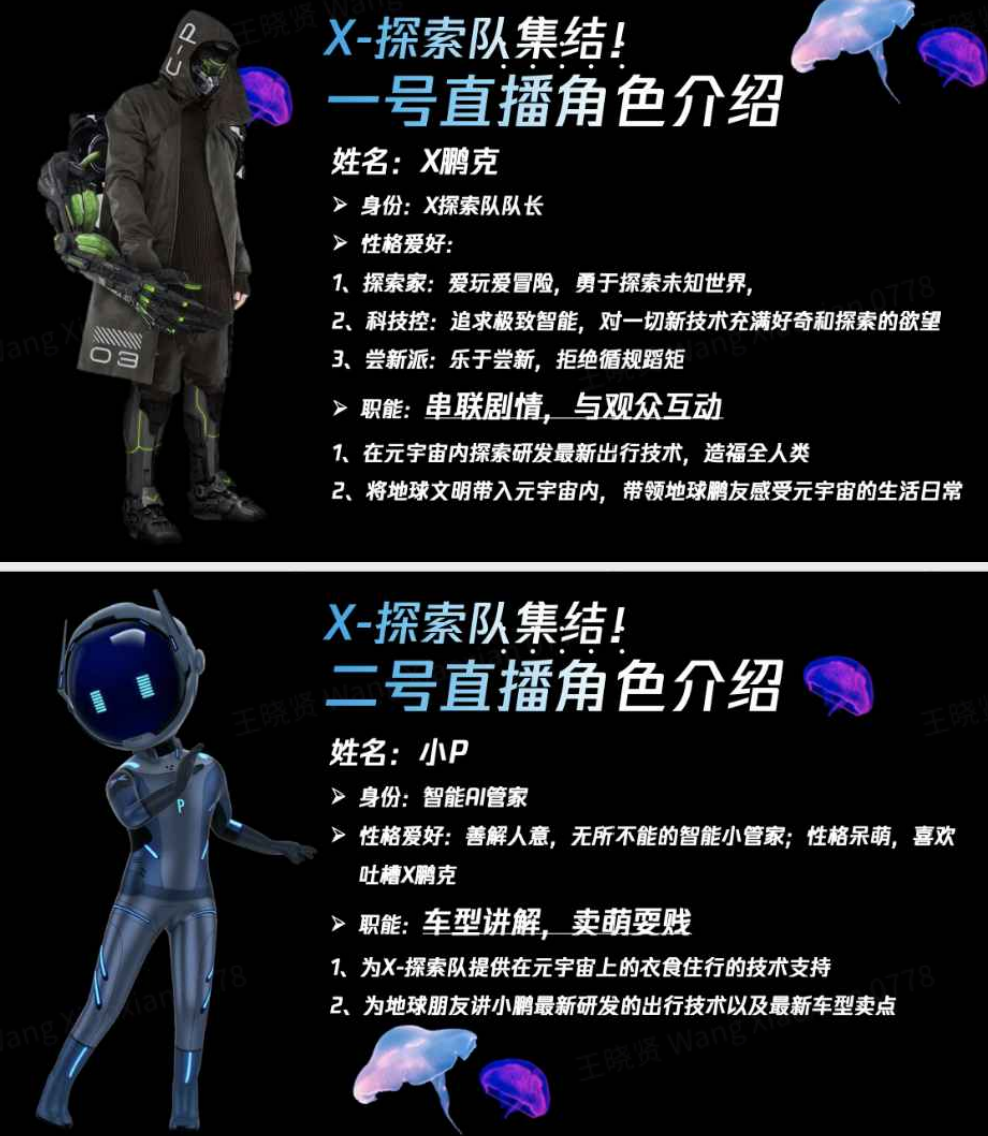 于是,X鹏克(探索队队长)、小P(AI智能管家)应运而生。他们需要进入鹏克星球收集资料、在元宇宙建造基地,改造环境、探索研发最新的出行技术。而鹏克星球的直播也分为四部分组成,涉及剧情探索、热点话题、虚实互动、合作共建的玩法。