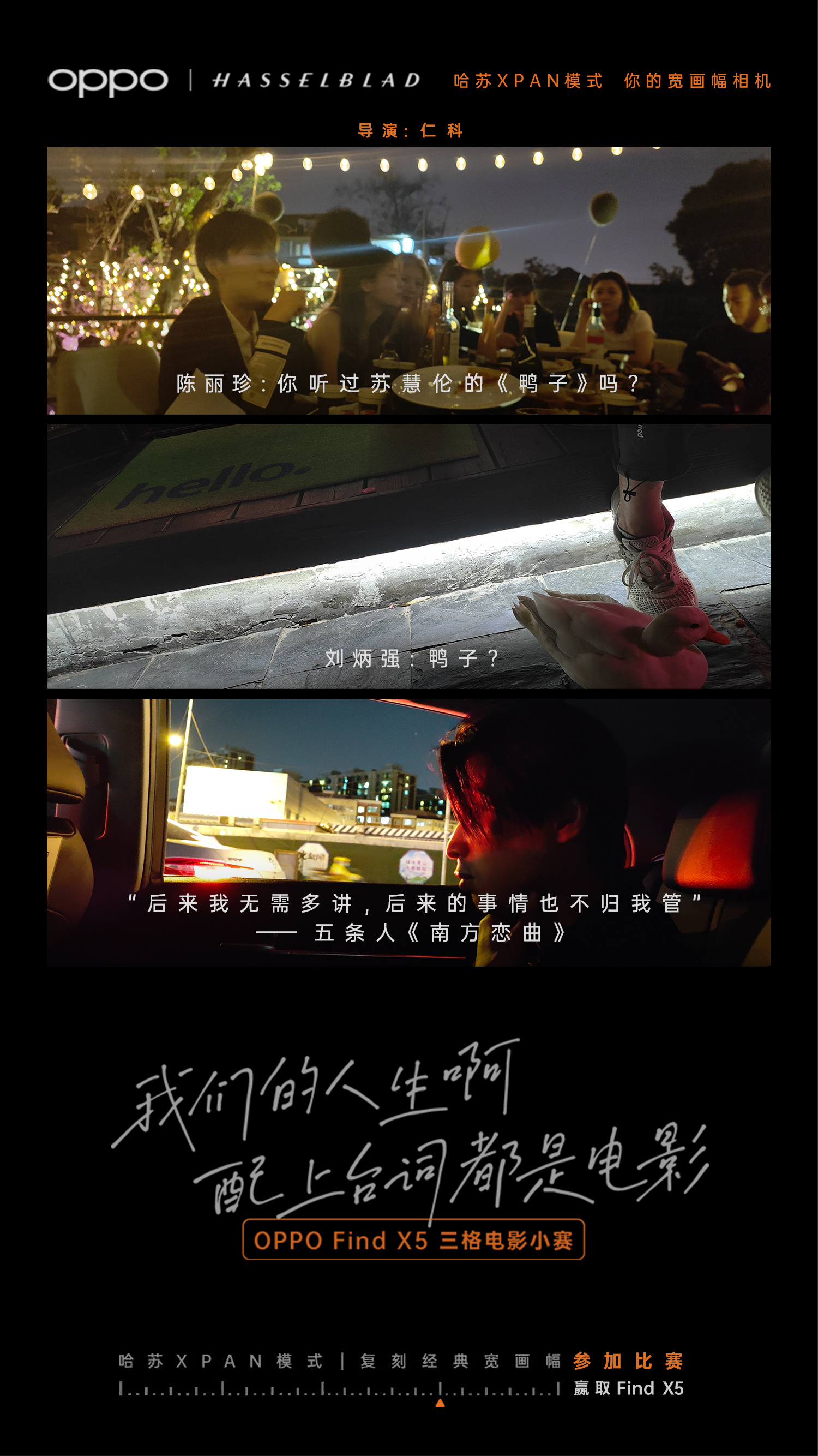 OPPO携手五条人乐队,围绕其Find X5系列拍摄了一部「电影」——利用Find X5系列的哈苏XPAN模式,记录下仁科和阿茂的对话。这里的「电影」打上了括号,因为它和以往的一些被称为微电影的广告不同,它全片是以一种播放照片,加以仁科和阿茂的画外音的形式呈现,真要说它和电影有什么联系,那就是有着电影质感的照片。而这些照片,正是用Find X5系列的哈苏XPAN模式拍摄的,OPPO想要通过这一点告诉大家:我们的Find X5系列,是可以拍出电影质感的!
