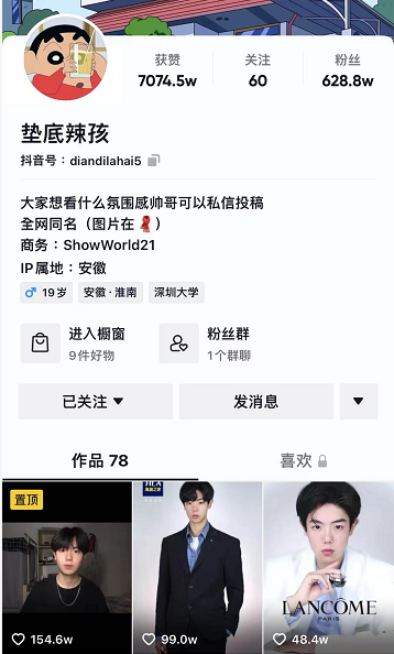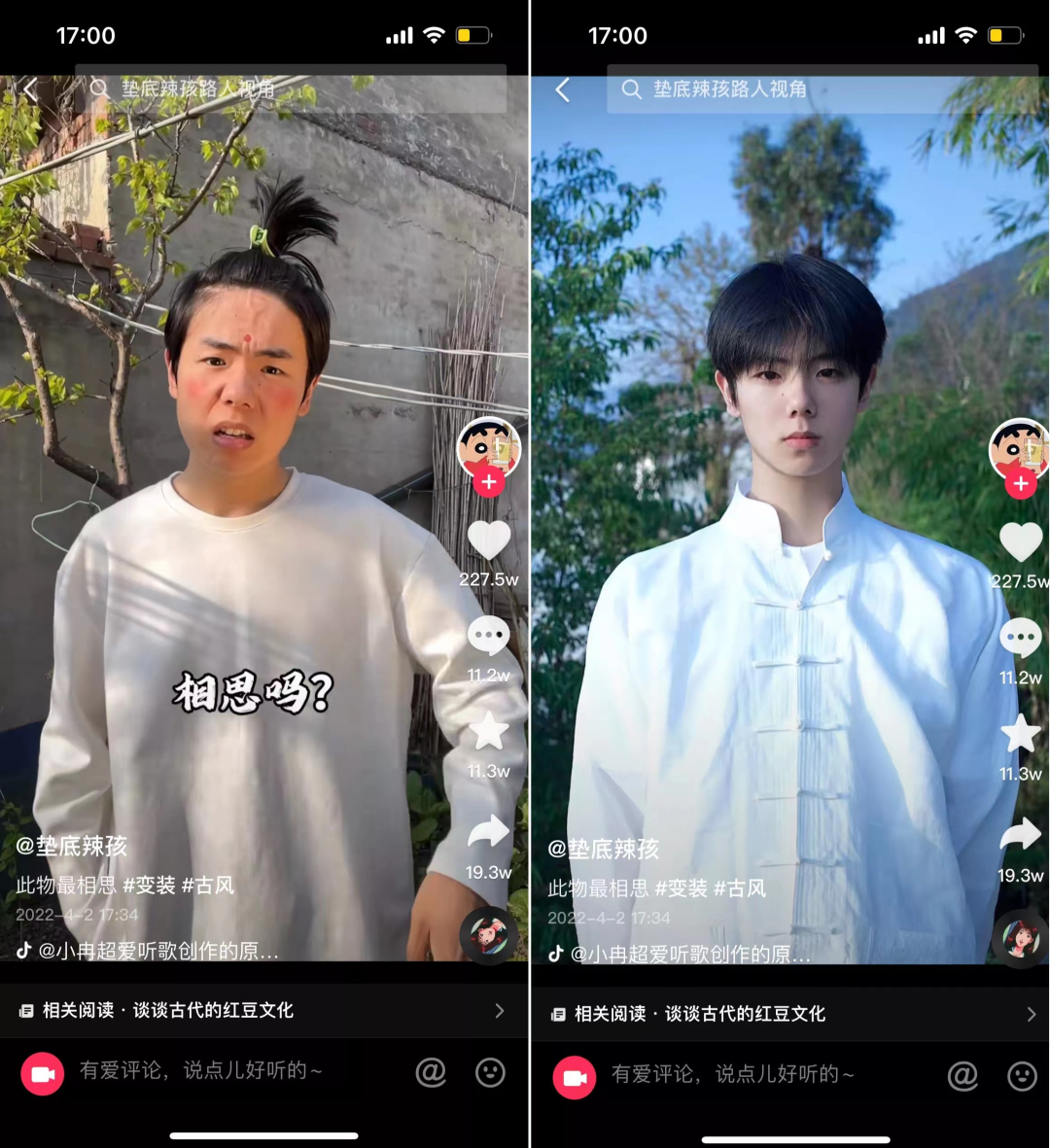 垫底辣孩的视频时长一般控制在30秒左右,从一开始就紧紧抓住大众眼球,多采用第一视角的拍摄角度,手抓各种道具,还加入一些对话、剧情和化妆环节,然后进行变装。这种有节奏的BGM卡点,前后出镜人物的差异,简短几十秒的观看体验,是变装的最大优势。不论是各有风格的国际超模,还是相思红豆的国风弟弟,美术生弟弟、公司白领等人设氛围,正是用户喜欢垫底辣孩的原因之一——达人能驾驭各种风格、带有浓烈少年感的神仙颜值。特别是在4月的两个爆款系列变装,注定他的快速成名水到渠成。目标放在整个抖音,头部男性颜值网红寥寥无几,这意味着该赛道具备较为明显的天花板。但要成为“氛围感天花板”,垫底辣孩还有很长一段路要走。一方面,在两个爆款系列中,红豆变装只产出单条视频,导致流量后劲不足。所以在后续的策划中,需要考虑相关爆款的持续性。另一方面,通过某个特定人设出圈的变装达人,要持续走红特别考验创意,比如垫底辣孩首条提出“氛围感帅哥”的视频中,就加入了相关美妆产品的内容,垫底辣孩还在评论置顶留言了视频中产品的品牌和型号。03