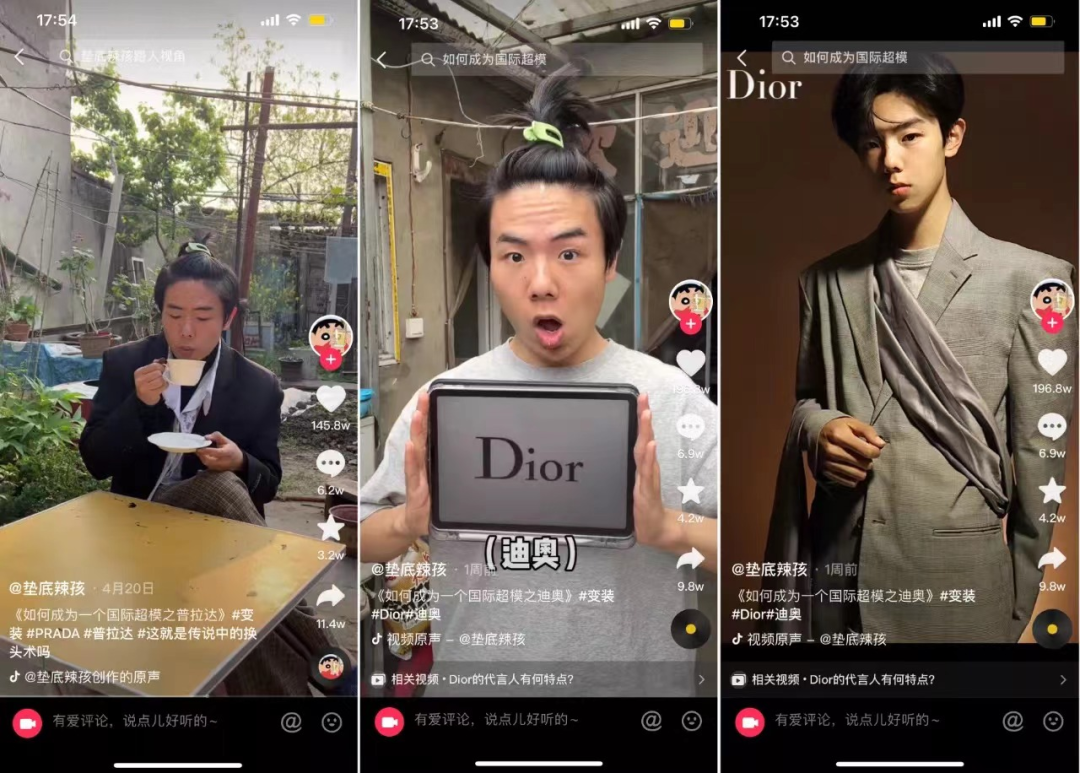 回到内容本身。事实上,早先已经有很多类似的博主在这个领域试水并获得成功。比如更早之前,就有博主@陆仙人用二手废品做衣服并上身走秀,获得大量喜爱与赞美声,视频中的他会用水边的芦苇做成维密的翅膀,将塑料雨棚改造为香奈儿同款披风,靠一双赤脚,一身“乐色”,一张扑克脸,在三年的时间内通过不懈努力从广西田间走向真正的时装周T台。采访中,陆仙人曾透露自己在“爆火”之前已经拍了一年的短视频,真正让他红起来的是一条裹着奶奶的毛毯在夏日艳阳下走秀的作品,而当时因为温度太高,拍完视频他就发了高烧昏厥过去,醒来时看到那则作品的点赞量已经超过200万。半梦半醒的疼痛中,他知道自己成功了。如上所述,你还会为品牌与素人或网红的结合感到惊奇吗?近年来,某些奢侈品牌在中国市场一年提价四次,他们一边通过高贵的身份与“普通人”制造距离,一边放弃完美无瑕的神秘形象跟你打破墙壁,在你感到既困惑又上瘾的滋味中制造迷恋,不禁为之埋单。奢侈品走下神坛不是一两天。曾经的你走进一家奢侈品专卖店,都会有一位衣着深色西装的男性为你拉开沉重的玻璃大门。现在碰到周末节假日你则需要站在门口排队等候,在商场的店庆时分则要忍受店铺内的拥挤甚至尖声破浪的叫喊。到了后疫情时代,中国成为全球奢侈品市场的一枝独秀。为了更好地抢占国内市场,奢侈品公司需要努力用不同的方式将自己的品牌故事讲述给消费群体来听,对于现在的环境来说,想赚钱,真的需要接地气。比方说,乡村的确可以被用来借助表达可持续的人文观点。04