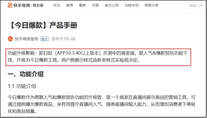 根据市场消息,快手电商官方最近发布了“今日爆款”产品手册,宣布自5月6日起,快手平台灰测期(4月28日至5月20日)中的商家端,聚人气和爆款预告功能下线,升级为今日爆款工具。