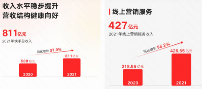 再来看快手的商业模式,在快手最新发布的2021年的年报中,可以看到快手营收服务双增长。