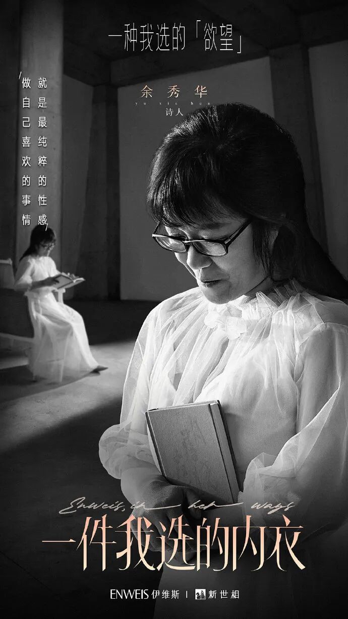 伊维斯x新世相的特别企划,最让人意外的莫过于余秀华的现身。她曾用诗歌的稿费买断了捆绑的包办婚姻,在谈性色变的环境中,她撕下了世俗忌讳的“蒙羞布”,将性与欲望写成了艺术。站在解放女性欲望禁锢的角度上看,余秀华是最适合的代表人选。某日光顾内衣店,她写下《从内衣店回来》,一如既往赤裸直白的语言,看似描绘性,实则道尽了过去婚姻给她带来的哀伤,丧失幸福选择权的苦难人生。买了两个胸罩,最薄的