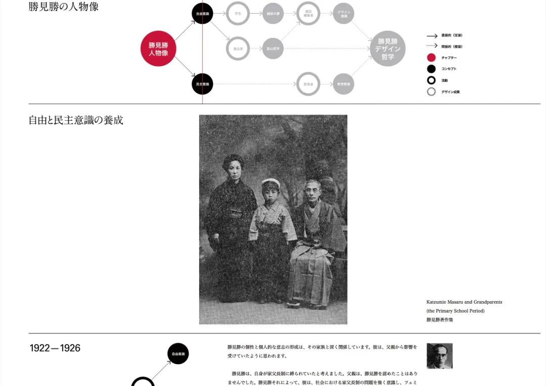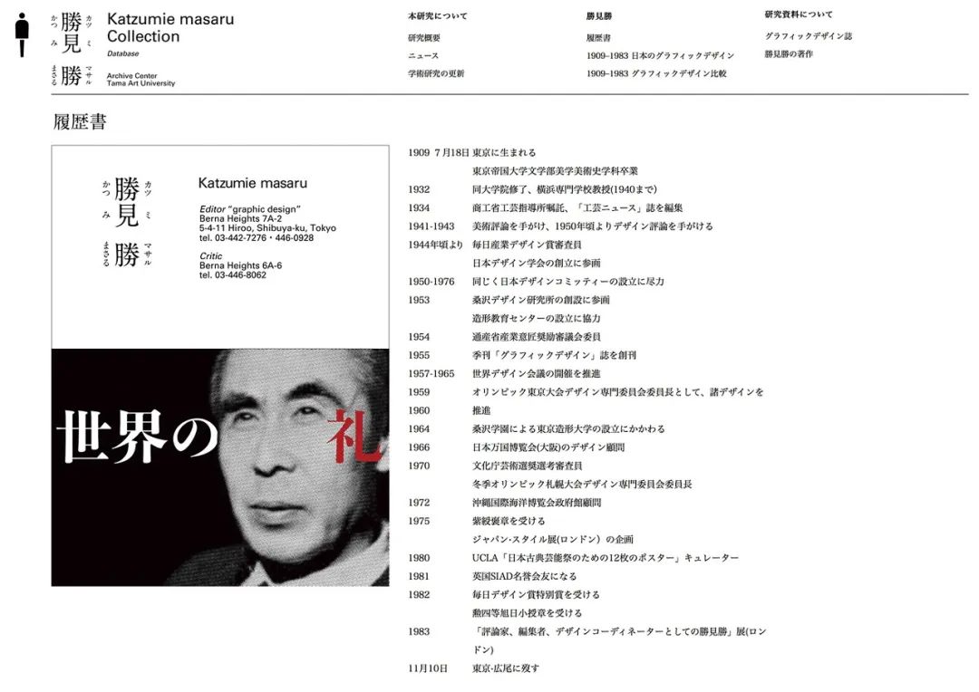使用者除了可以直接在胜见胜藏品档案库中通过分类查找或索引的方法搜索到藏品档案资料外,还可以通过了解胜见胜的个人生涯,思想和设计哲学等内容介入藏品档案库的浏览,这通常是数字档案库设计所并不具备的能力。