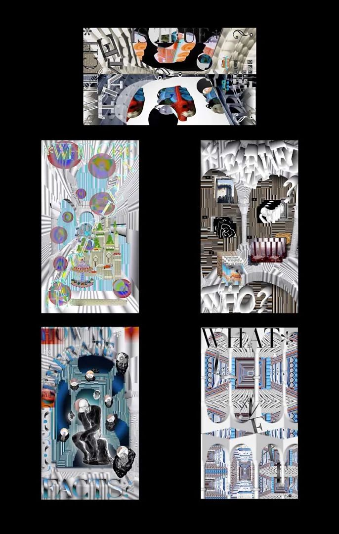 在这个作品中,3这个数来源于斐波那契数列(12358数列),有1处场域、2句阐释、3种秩序、5个问题、8个道具。问题分别是:如何生成事实?哪次是真实的?谁做出了解释?谁创造了真相?下一个出场的?我选择埃舍尔的矛盾空间作为线索,每个问题对应空间中的一个角度,在可见的5个面内循环。