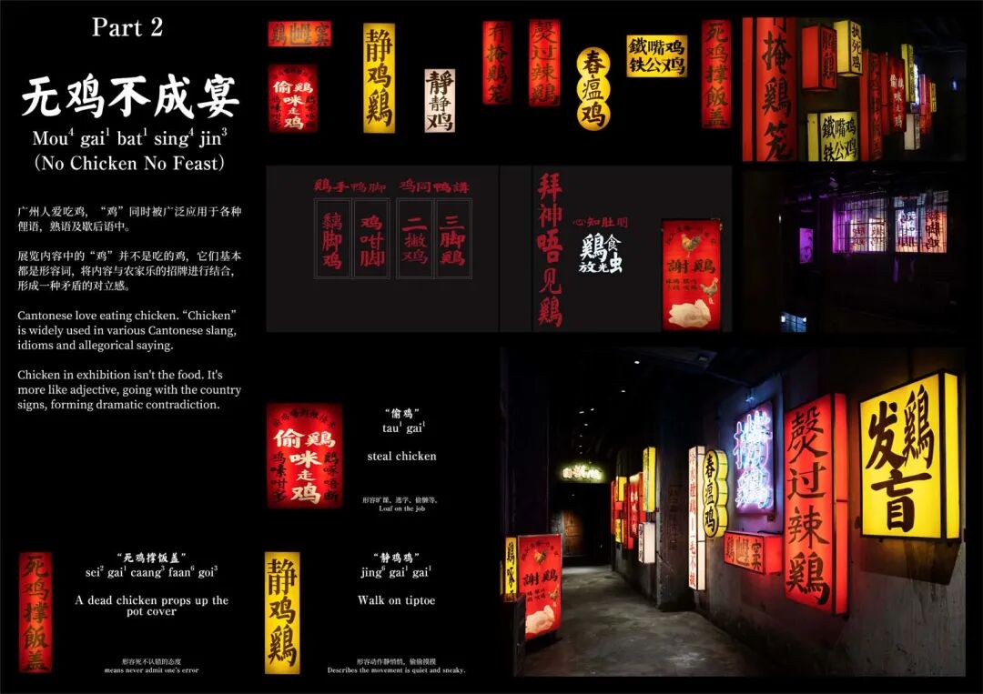 作者以观察员和设计师的双重身份对粤语进行了系梳理并转换为视觉探索的一个展览,把对语言的观察集中在广州人日常的对话交流中, 脱离教科书式的语言研究方式,更多的是呈现市井生活中的“俗”,成为记录一种社会现实“掠影”,通过展览让观众感受到粤语的鲜活与生猛。