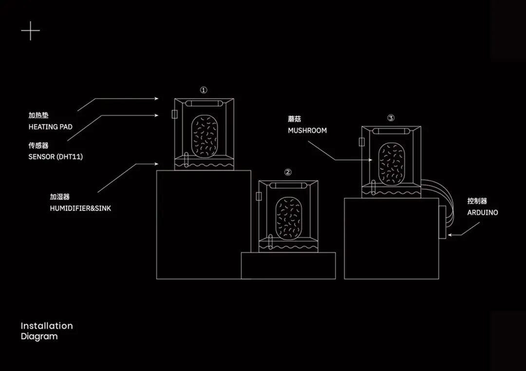在互动过程中,观众可以在网页上选定一个目标地点,通过 open weather api 获得当地实时天气数据。由arduino操控的蘑菇培养箱将根据数据调节箱内温湿度,复制目标地点的气候环境供蘑菇生长。