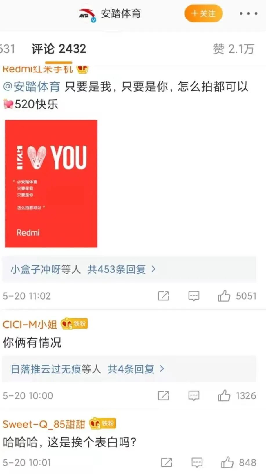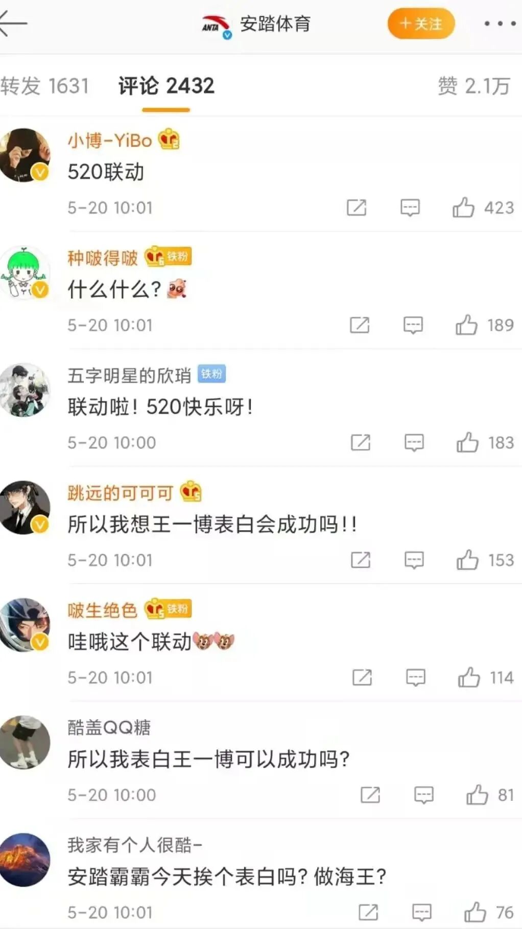 安踏要实现的不仅仅是流量的全覆盖,还有大众对于品牌、产品认知的覆盖刷新,只有立体、全方位的解读和展示,在潮流领域施以重击,才能让本次营销主题“再霸道一点”深入人心。年轻人对小众文化的喜欢,让许多小众圈层快速壮大,如今已经形成庞大的体量。二次元便是当下热火朝天的圈层之一,聚集了大量的年轻人。安踏聚焦年轻化喜好,通过邀请知名插画师安贤杰为产品量身绘制霸道家族系列插画,一举打破次元壁,跨界二次元的方式让其更形象化、人格化突出球鞋的个性特点,无疑是当下品牌跨界创意的典范。此外,安踏更是巧慧年轻人“磕糖”属性,展开蓝V联盟#520霸道表白#的创意联动.520当天,品牌互相展开生动表白,全网撒糖,引发全网热议,成功触动大众的磕CP心理,也让520的互动场域更加宽广。从代言人引发的全网告白,安踏用霸道的姿态诠释本次活动主题“再霸道一点”,充分发挥出代言人效应、联动玩法。其逻辑是围绕绕年轻人喜欢的方式,从年轻人圈层出发,最终将营销回到年轻人身上。缜密的逻辑是品牌用心深入消费者心理的表现,也是品牌实力的展现。