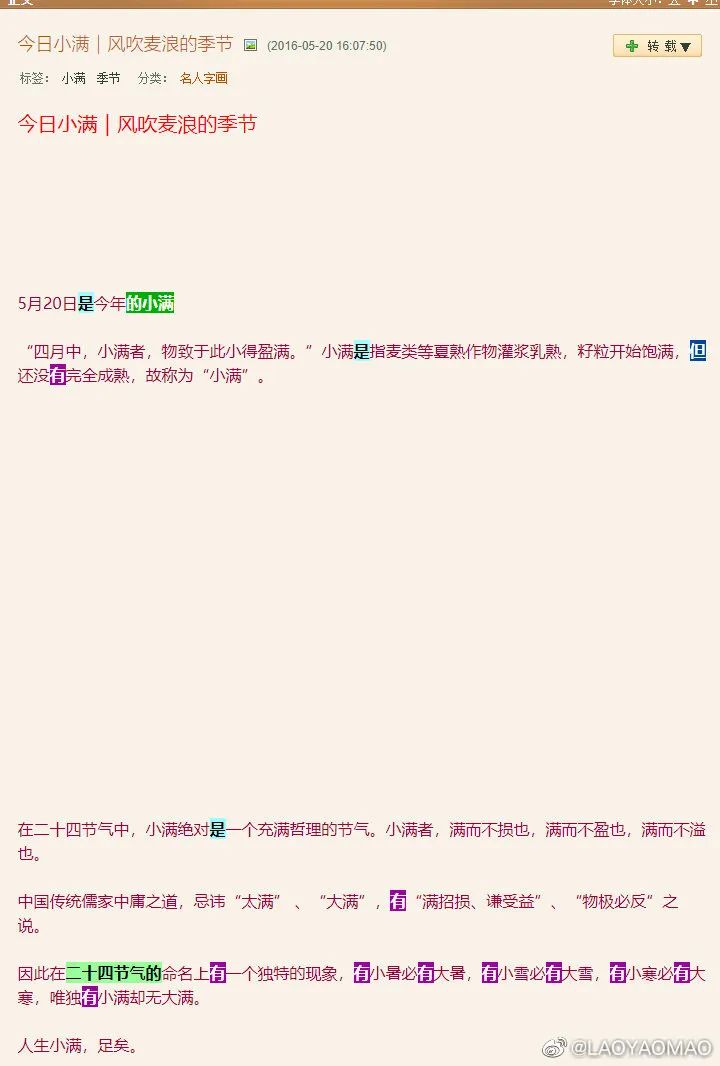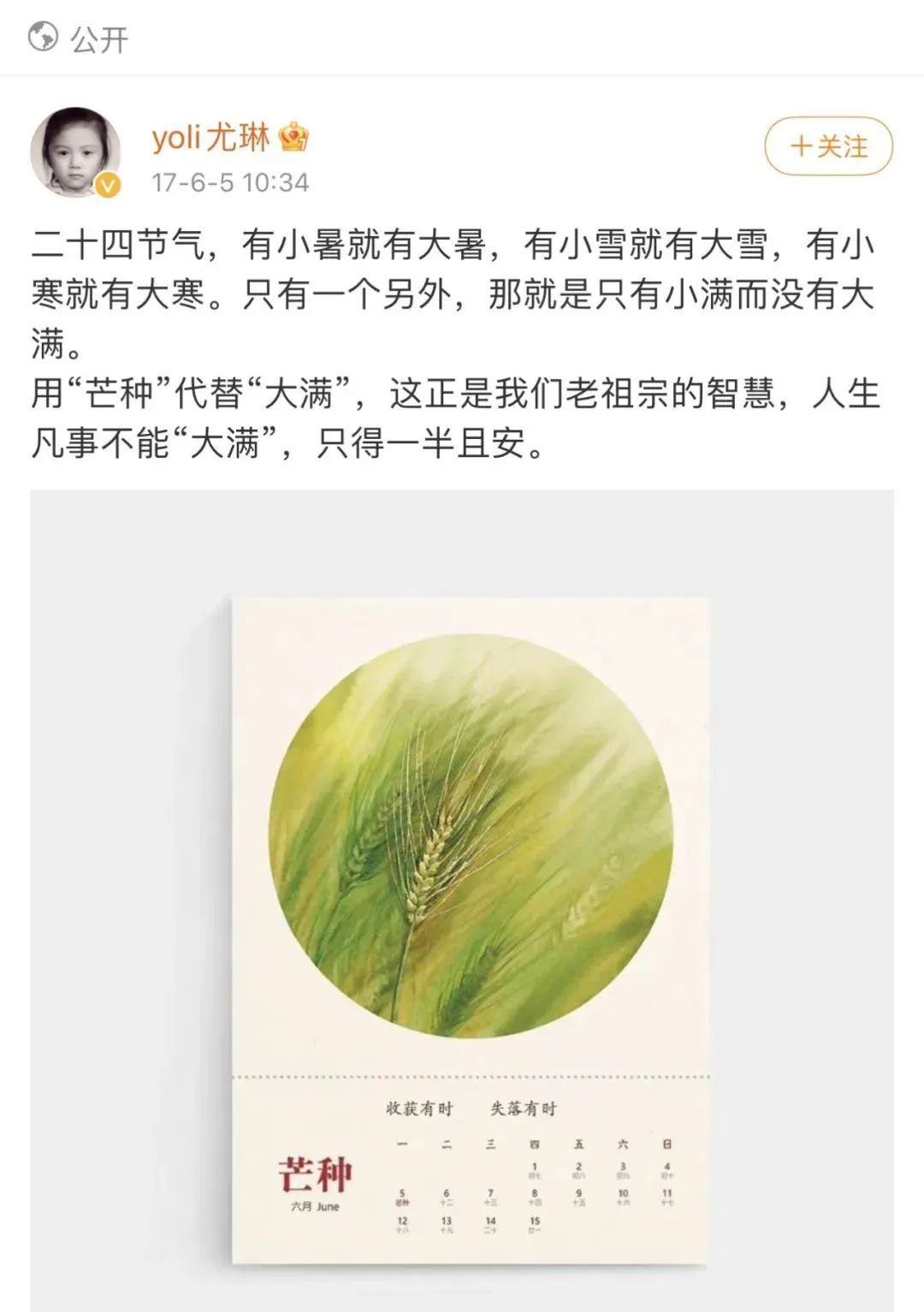 不是我马后炮自卖自夸,就在小满前几天,听到公司的同事有提到正在做小满的节气稿的时候,我突然想到:咦,好像有小满但没有大满哦,有小暑和大暑,有小寒和大寒,但就是没有大满。可能古人觉得“大满”这个词不太好吧。
