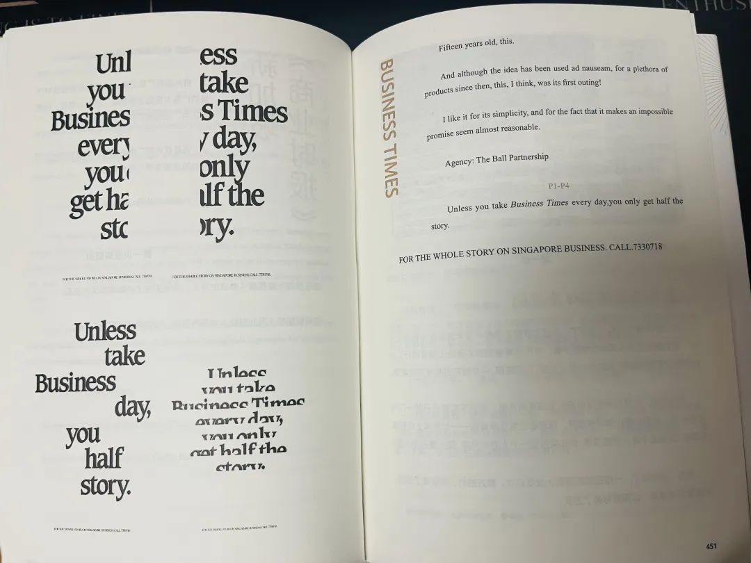 应该也许是首个玩文字创意的广告了。而且创意妙处还在于,文案的内容和创意形式本身和创意表达的核心策略是一致的:即表达“《商业时报》能给你新闻事实的全貌”。