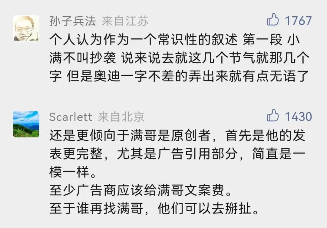 但北大满哥将这个观点经过自己的思考以更系统更全面更有逻辑的表达出来,奥迪再将这段文案搬过去直接用,那就必须是抄袭了。