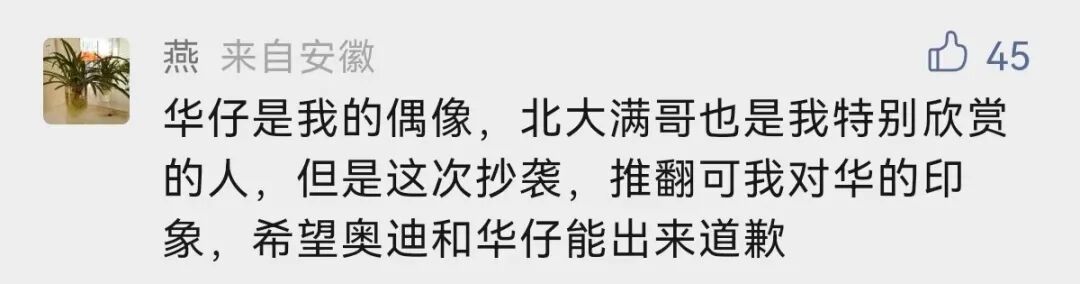 “北大满哥”先是在评论中指责抄袭,后来深夜发布了一条题目为“被抄袭了过亿播放的文案是什么体验?”剑指奥迪和刘德华。