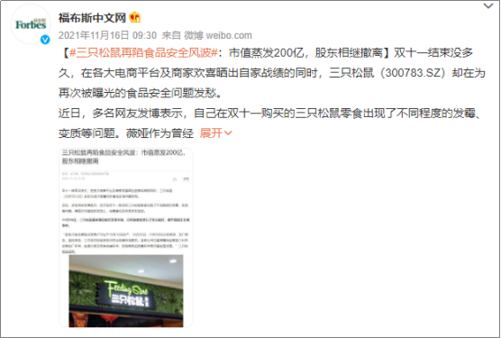最明显的是食品安全问题,正在稀释三只松鼠的品牌。
