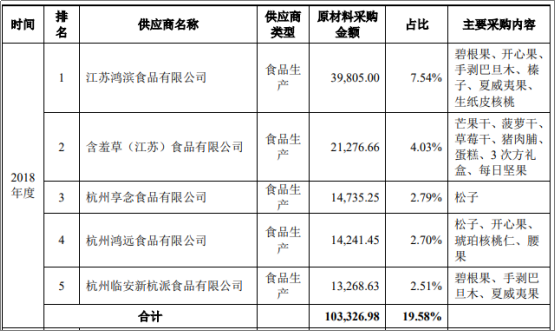 在两家公司都被市场监管部门通报的情况下,与三只松鼠的合作依然牢固。两者都名列三只松鼠2018年前五大供应商,其采购占比超过20%。