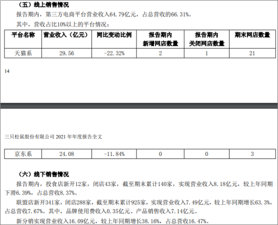 数据显示,2021年三只松鼠线下销售额增长6.78亿,增幅达到27.14%。但当年,其线上第三方平台销售额下滑了7.25亿,其中天猫系下降了22.32%、京东系下降了11.84%。