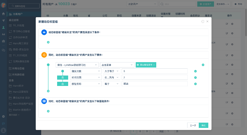 自动回复不仅仅是关注、留言的时候需要,针对更多其他的单个或多个互动行为的组合,也可以自动触发自动回复。比如在服装品牌的微信公众号,当粉丝多次点击小程序中的裙装产品,或菜单中的裙装按钮,即触发裙装指定优惠券。在Linkflow中,先通过动态组筛选7日内点击裙装菜单超过5次的用户,然后针对加入该动态组的用户发送裙装优惠券。