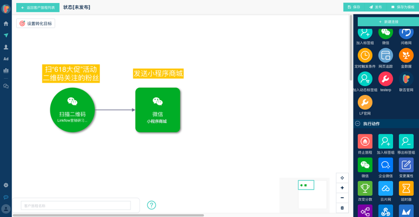 品牌同时在做的活动或者吸粉渠道通常不只一个,比如品牌在地铁广告投放618大促的广告,关注后需要回复小程序商城。同时日常有老带新的邀约活动,新粉丝关注后需要回复老带新专属优惠券。别忘了,还有通过直接搜索公众号关注的粉丝,对他们回复通用内容即可。这就有三种不同的关注回复场景,对应三种不同的消息内容。Linkflow可通过设定粉丝扫码的UTM参数值,触发不同的消息内容,如下图,针对618活动关注的粉丝,发送小程序商城。