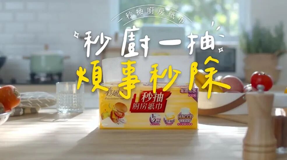 春风一秒抽厨房纸巾视频广告的结语文案。觉得这句“秒厨一抽”有点拗口,干脆改成秒抽厨纸,烦事秒除吧。