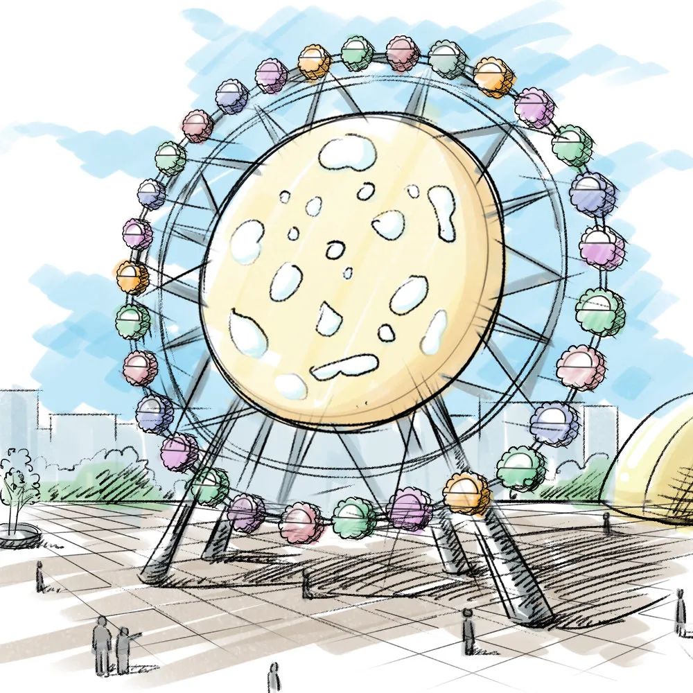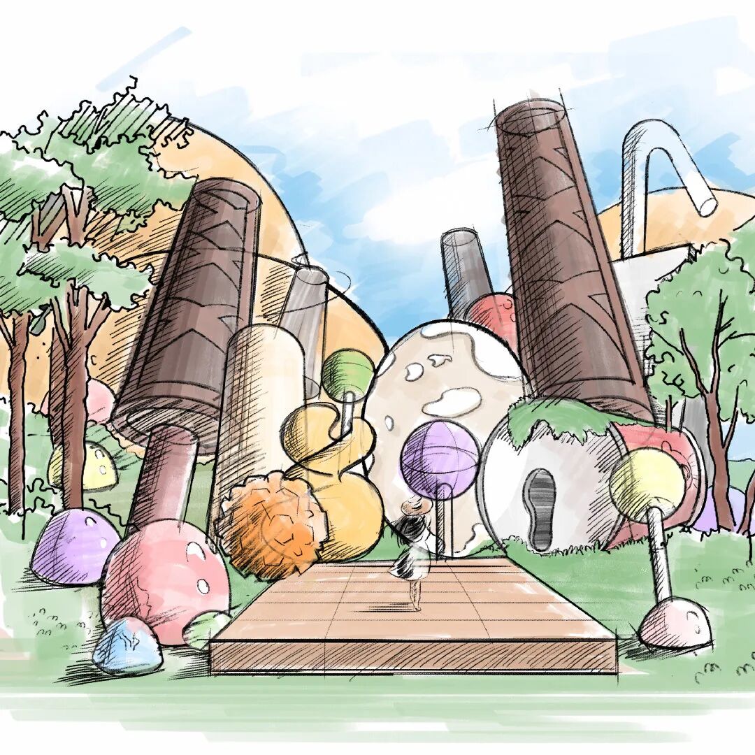 看看设计稿,小小酥金矿山探险、雪饼月光摩天轮、旺旺巨型零食森林、旺仔小馒头大剧院、旺仔牛奶激流勇进、O泡疯狂过山车。