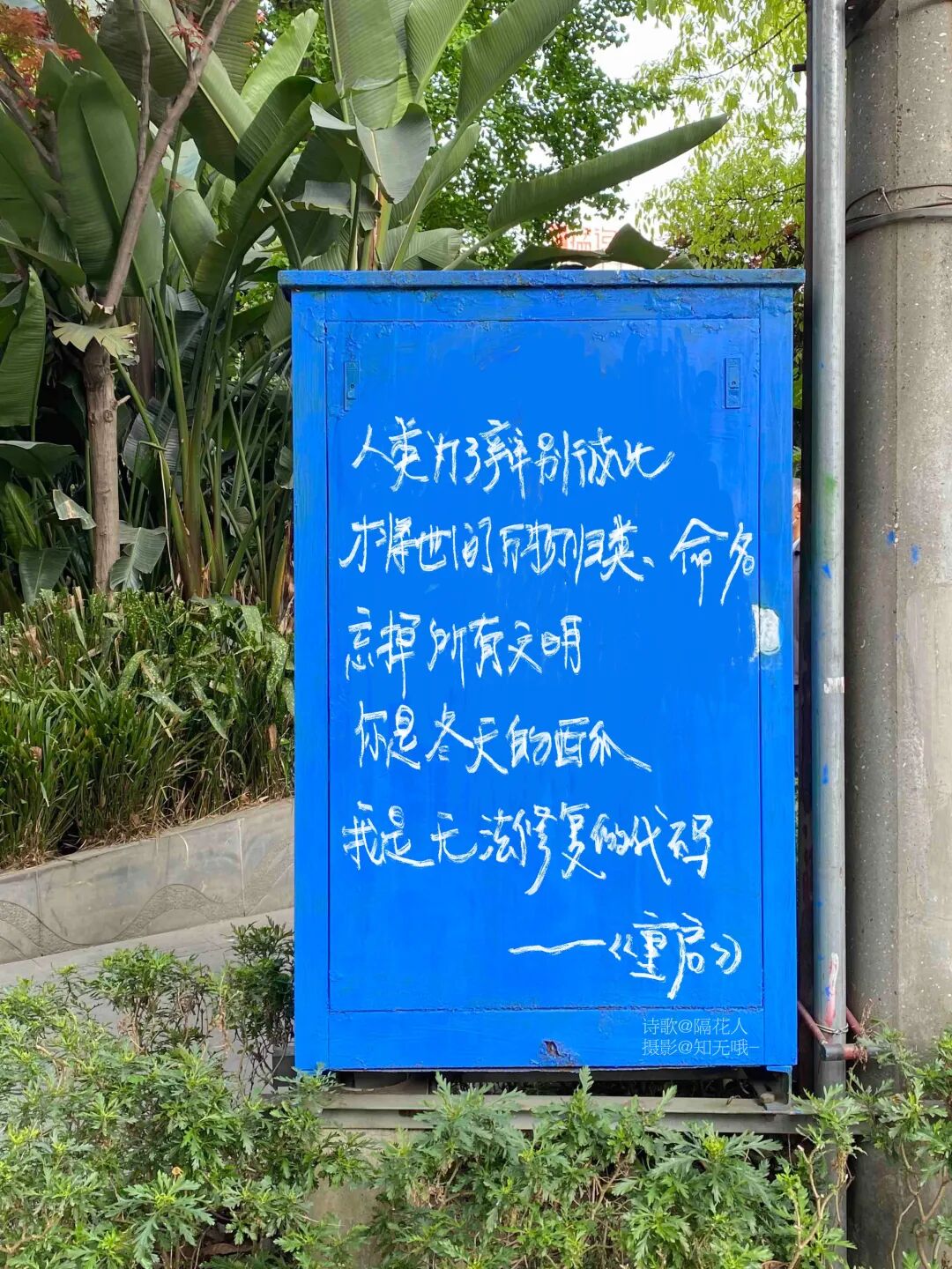 书是最便宜的旅行,旅行是最深情的阅读。读书和旅行,真的一个都不能少。微博上有个博主@隔花人 发起并创作了一个诗歌实验,以生活中随意拍到的照片——诗歌载体,进行二次诗歌创作,走到哪写到哪,想到什么写什么。一面墙,一辆车,一棵树都可以成为诗歌的容器或载体。尽管不能真的写上去,但相信世界上总有一个角落,放得下诗歌的自由。