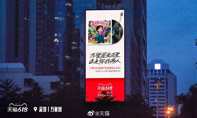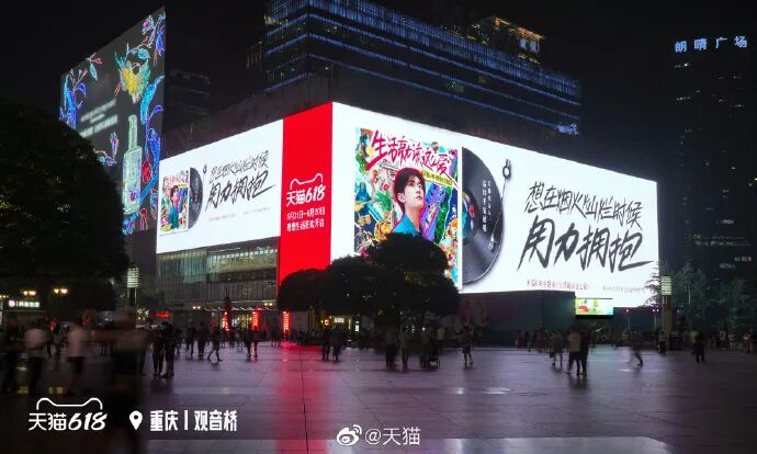 值得一提的是,天猫还把歌词做成海报,锁定深圳、广州、杭州、成都、重庆等城市线下大屏投放,给大家营造触手可及的鼓励。