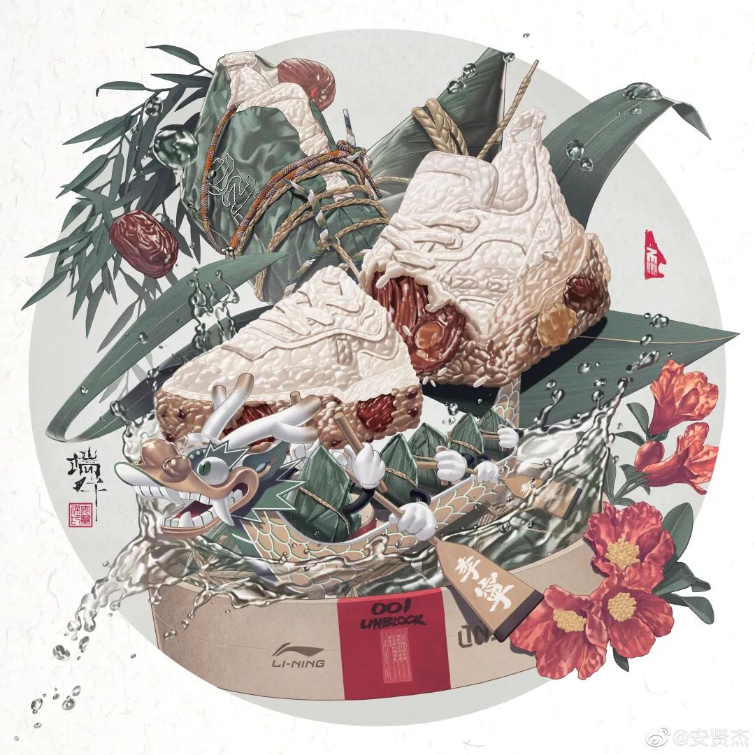 来自插画师-安贤杰绘制的主题作品,以类似传统年画的风格设计。以限定鞋子款式为主,将其画作一个切开的粽子,并加入了粽叶、龙舟等端午元素。