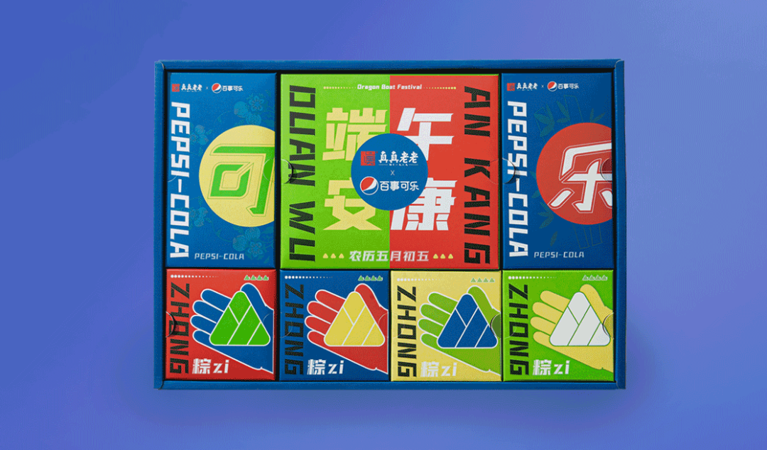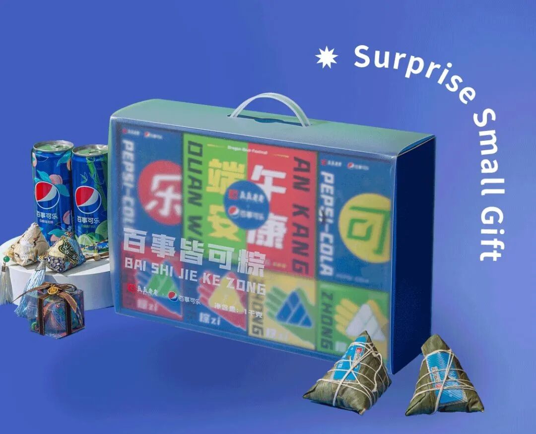 这是百事可乐和粽子品牌“真真老老”的端午节联名款,先不说口味如何,设计还是非常吸引眼球的。礼盒外观上的透明磨砂白膜印有“百事皆可粽”主题文字,简约又不失质感。