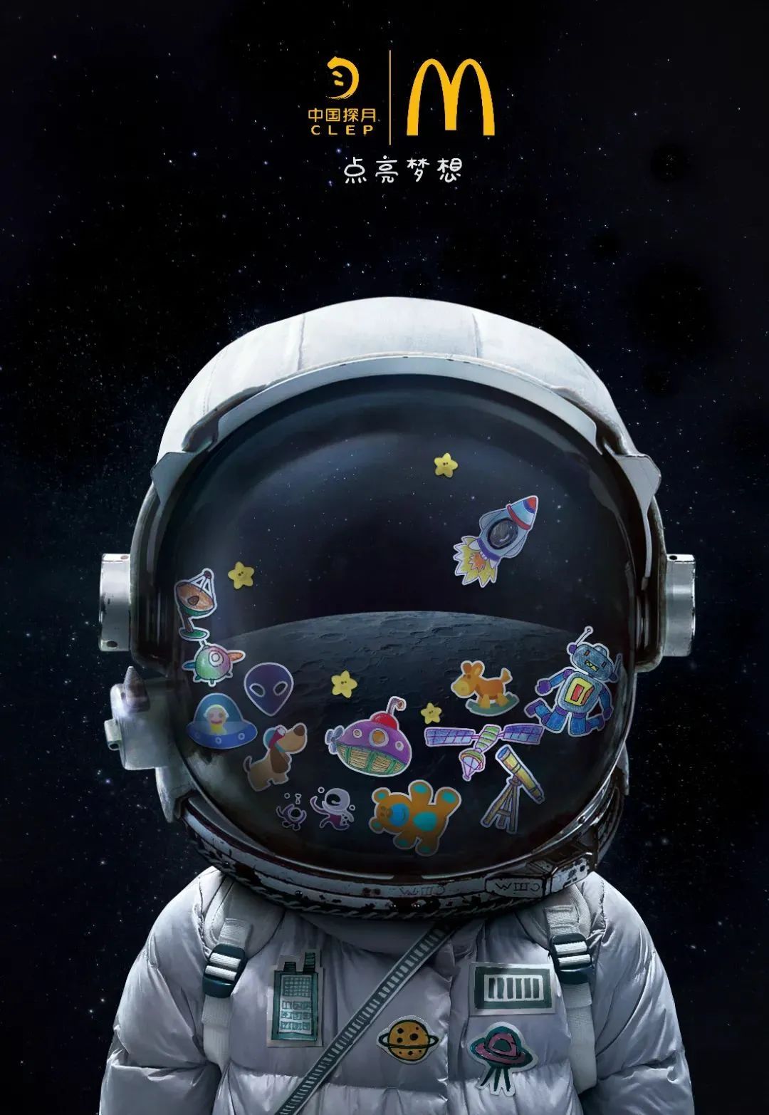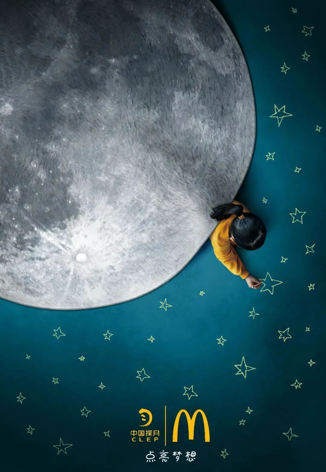 2020年,麦当劳携手中国探月打造了一场“去月球开画展”活动,让孩子们的画作随嫦娥五号奔向月球。并为此邀请黄海设计了以下3幅“点亮梦想”主题海报: