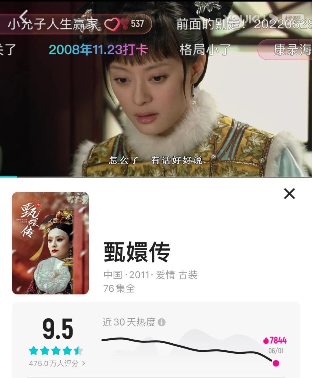 2018年,优酷从陷入经营困境的乐视手里拿到了《甄嬛传》分销版权。上架之后,一周内播放量就达到了1.5亿,直到2022年6月1日儿童节,《甄嬛传》在优酷站内的热度仍然达到了7844。