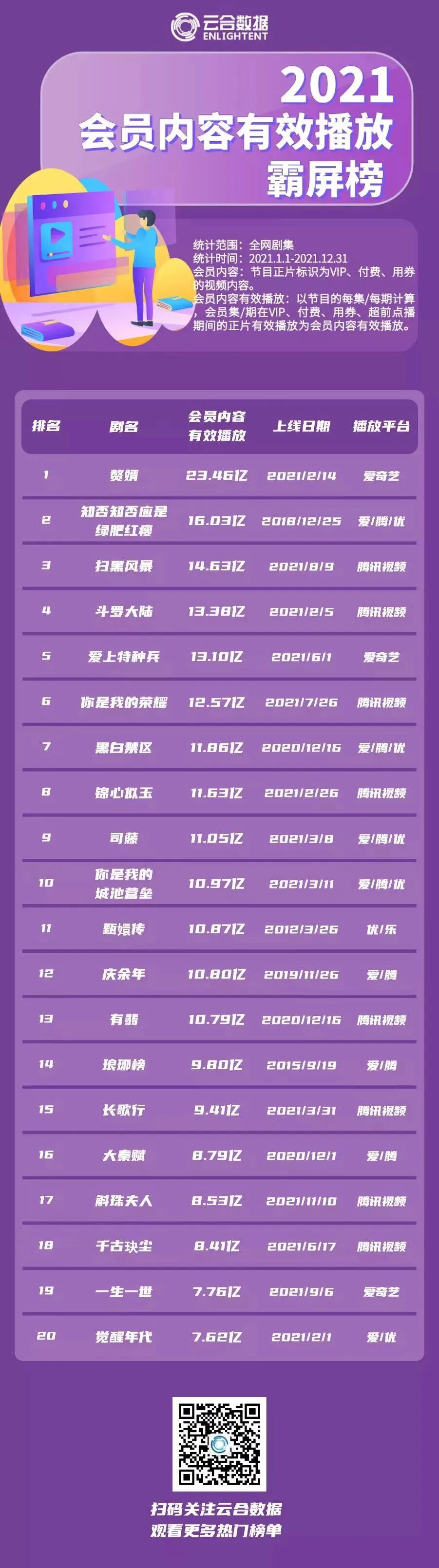 这个问题应该有请各大耗费巨资的S+们都来聊一下。没有人比它们更有资格来聊这个问题了,毕竟它们的剧设都是花了大钱但得不到观众青睐的大怨种。 到底是老剧常看常新,还是新剧苟且不给力?观众心里都有答案,建议制作方自己想想。 云合数据显示,2022年第一季度,老剧(此处指上线于2021年1月1日前的剧集)有效播放占全网剧集有效播放的54%,累计414亿。在全网剧集大盘下滑9%的情况下,老剧播放量逆袭上涨4.3%。 2021会员内容有效播放霸屏榜中,《知否知否应是绿肥红瘦》以超过16亿的会员内容有效播放排名第二,《甄嬛传》排11,常看常新的《琅琊榜》也在第14位。