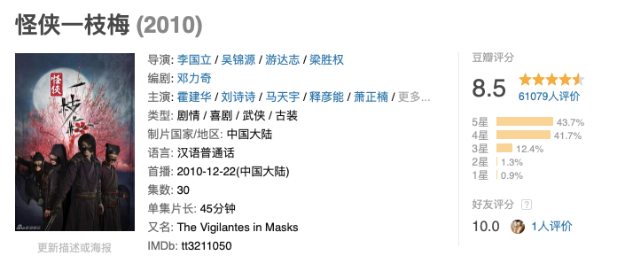 在up主们激情的公开处刑场面对比里,kk决定重温一下这部剧。 从有钱的鹅厂到猕猴桃,最后在优酷的仓库里找到了正片。啃老的优酷,又赢一局,谁看了不说它好命。 于是拉踩开始蔓延,从《怪侠一枝梅》到《且试天下》,过去十二年间,武侠剧的退化又何止是打戏。 《怪侠一枝梅》的故事,讲述的是“当朝第一通缉犯”离歌笑、“燕子神偷”燕三娘、“翻江大盗”柴胡、“千面戏子”贺小梅,四人因追讨赈灾黄金案而汇聚一堂,在朝堂污糟江湖动荡的大明朝,惩奸除恶的故事。 以单元剧的形式展开,没有干净到让人感觉现场有甲醛味的场景画面,主角也不是动辄上天入地的超凡绝伦人中龙凤,他们有各自要淌泥潭和为了抵抗腐败在乱世中求生的代价。