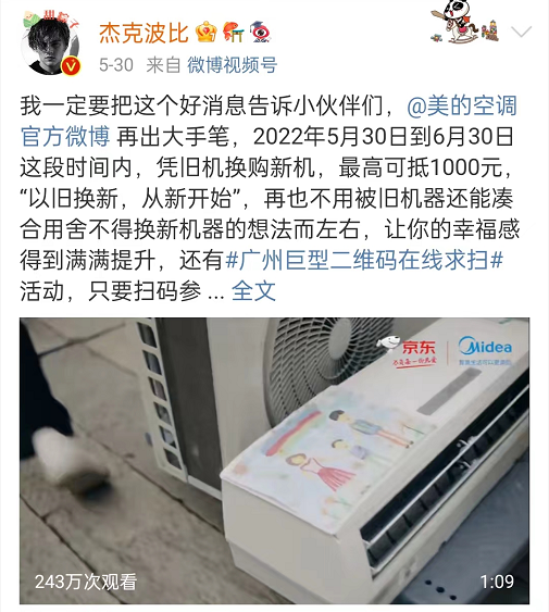此外,@追风少年刘全有 @杰克波比 等微博头部泛娱乐KOL分享美的空调线下大事件,扩大传播矩阵,实现更深层次的人群圈层辐射。