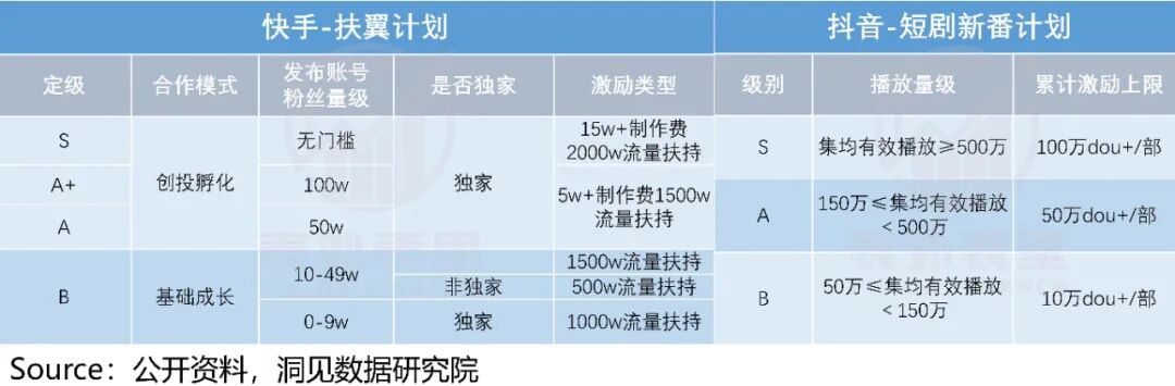 以短剧来说,快手从星芒计划到扶翼计划,不断下调准入门槛,甚至包括零粉账号,也可进入扶持计划之中。而反观抖音,扶持计划上更偏向MCN机构,准入门槛较高。