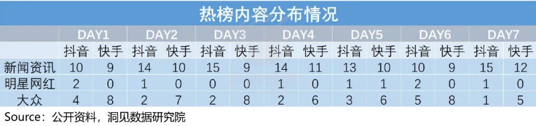 就话语权因子来说,我们统计了两平台一周的热榜内容,数据显示: