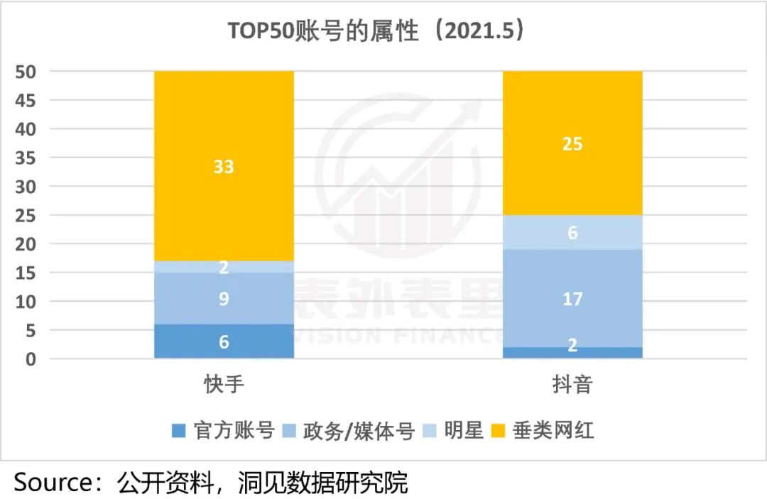 这在统计数据上也有所反映,截至2022年5月,抖音粉丝数量排行前50大的账号,政务媒体和明星占比大多数;而快手垂类网红比例更高。