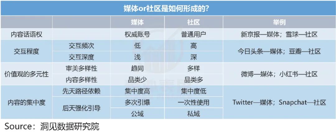 内容话语权:核心话语权掌握在权威账号手中,偏向于媒体;由普罗大众创作内容,偏向于社区。