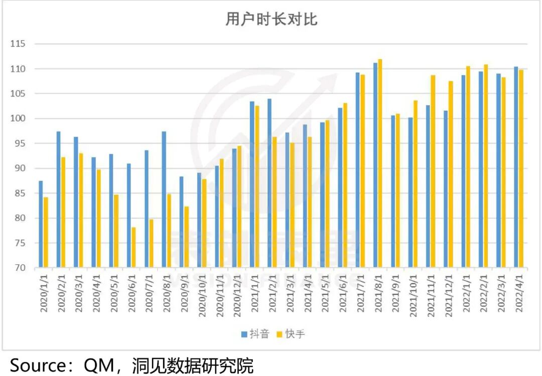 一方面,用户生态良性增长:2022Q1快手MAU接近6亿,与抖音差距缩小;2021年8月-2022年2月的大半年里,快手用户时长优于抖音。